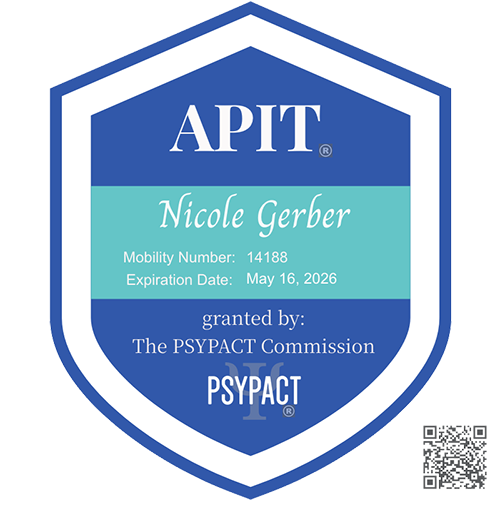 Dr. Nicole Gerber has Authority to Practice Interjurisdictional Telepsychology (APIT) in PSYPACT participating states. For a list of current PSYPACT participating states, please visit their website at: http://www.psypact.org